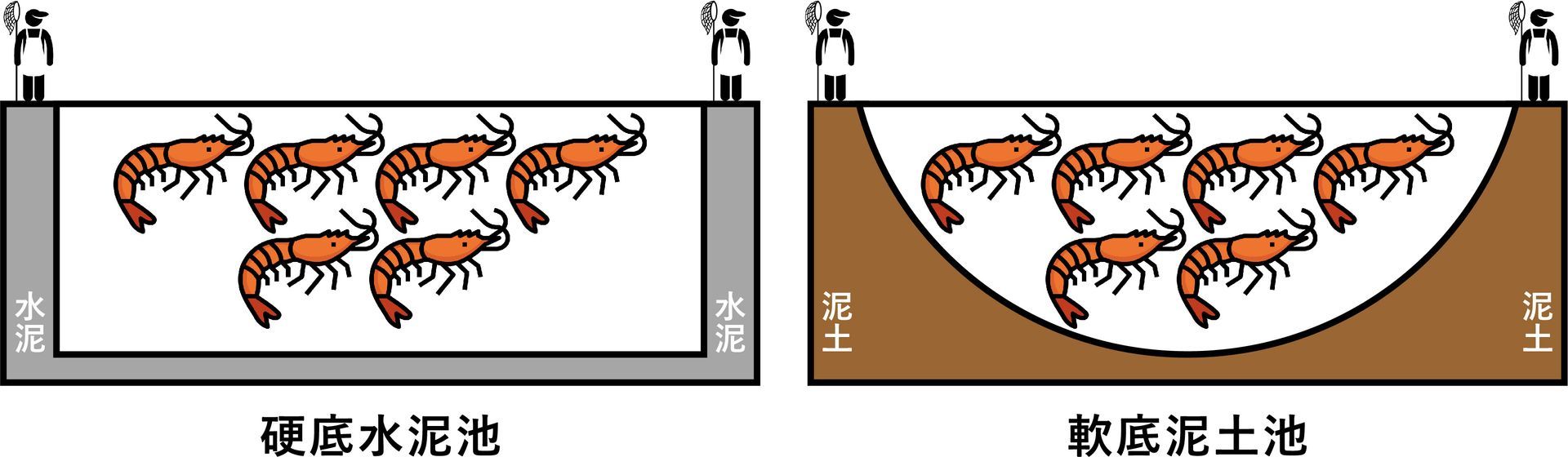 硬底水泥池如同低公設比的透天厝;軟底泥土池如同高公設比的公寓大樓。相同坪數,水泥池住起來更舒適更大,可以容納更多蝦子呢!